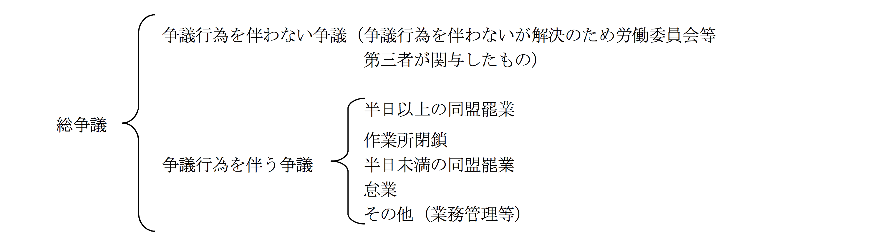 この調査の対象となるすべての労働争議を総争議といい、これを大別して争議行為を伴う争議と争議行為を伴わない争議(争議行為を伴わないが解決のため労働委員会等第三者が関与したもの)とに分けている。