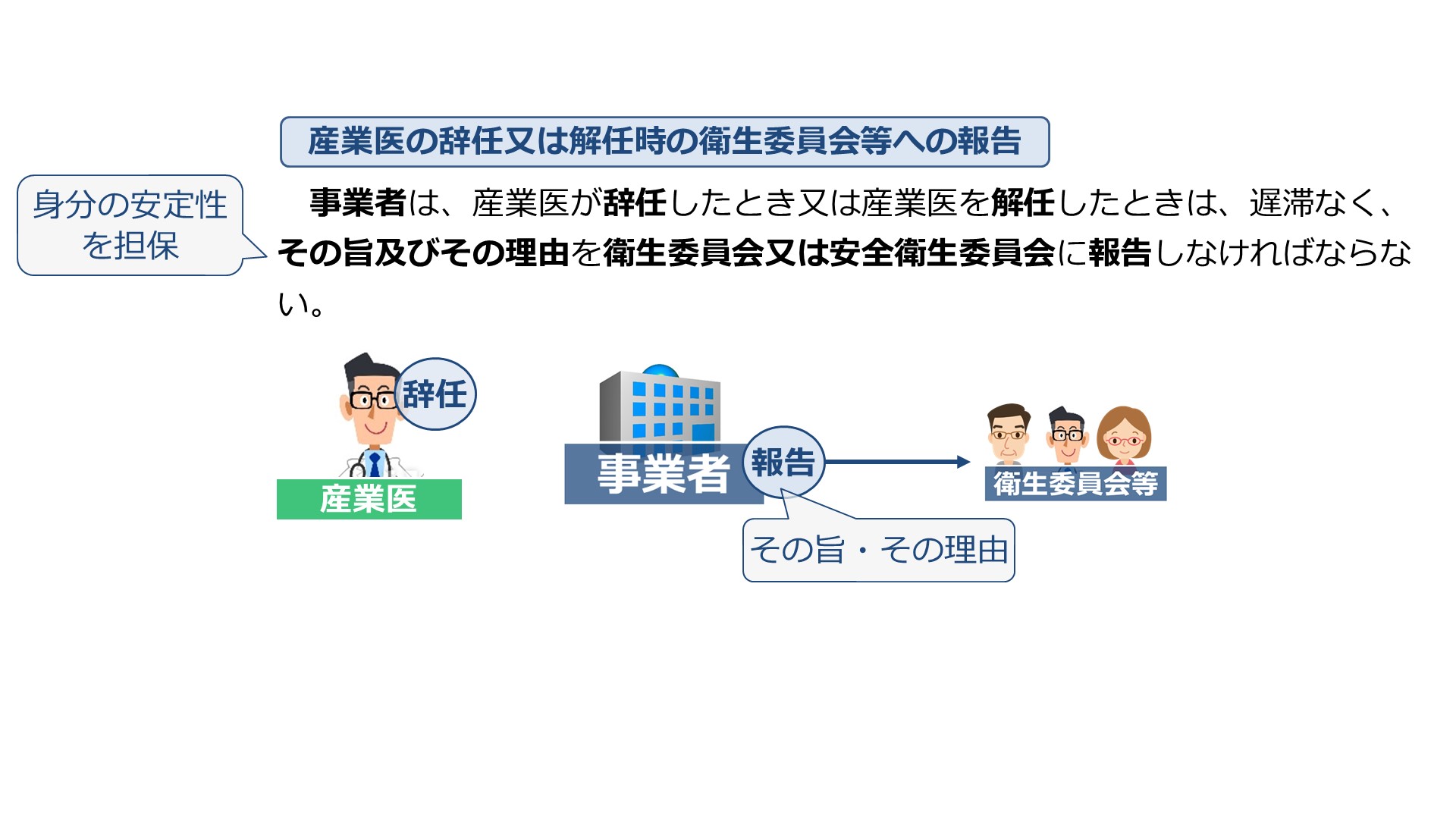 産業医の身分の安定性を担保し、その職務の遂行の独立性・中立性を高める観点から、事業者は、産業医が辞任したとき又は産業医を解任したときは、遅滞なく、その旨及びその理由を衛生委員会等に報告しなければならないこととしたものであること。なお、「遅滞なく」とは、おおむね1月以内をいうものであること(以下同じ。)。
