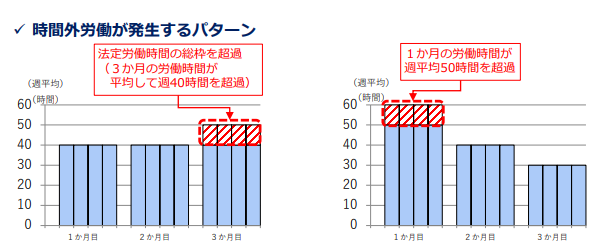 3ヶ月平均で週当たり40時間の範囲内でも、ある単月に飛び抜けて長時間労働になるのは健康によくないからNG、ということ。