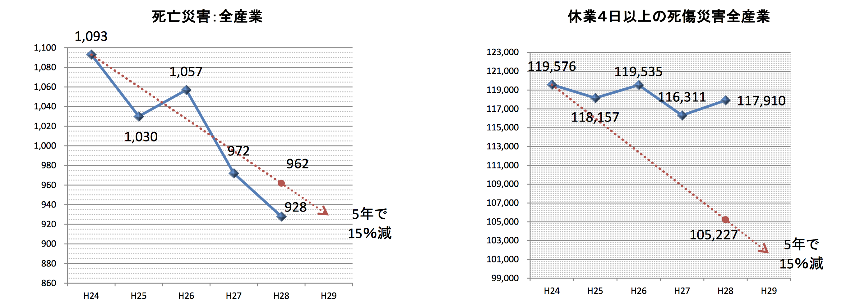 死傷災害→増減を繰り返しており、目標には届かない状況→着実に減少とはいえない。第3次産業の小規模店舗(安全管理が行き届きにくい)で増えている模様。