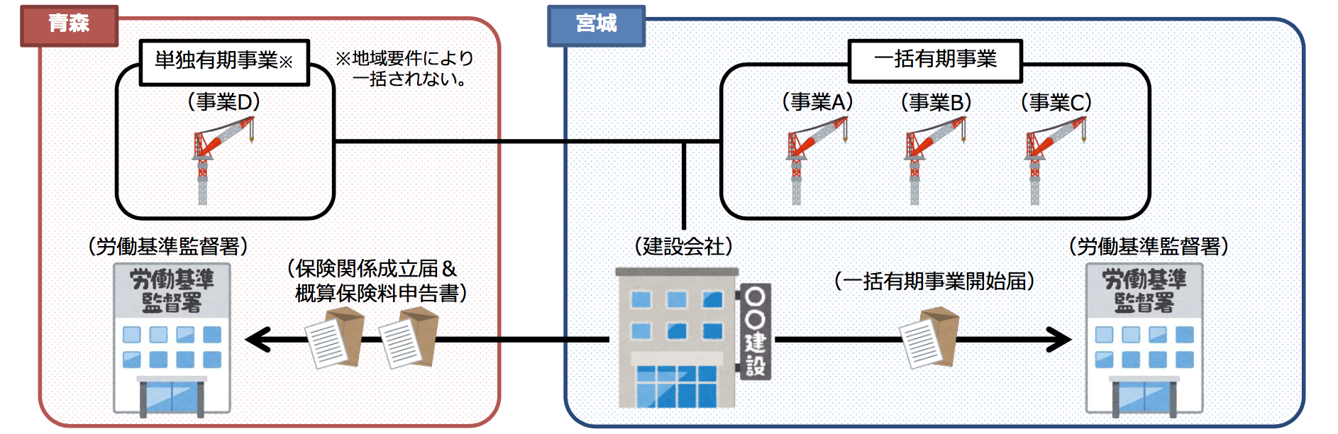 結果、単独の有期事業として、事業Dについては、別途、保険関係の成立届、及び概算保険料申告書を青森局管内の労働基準監督署に提出することになります。