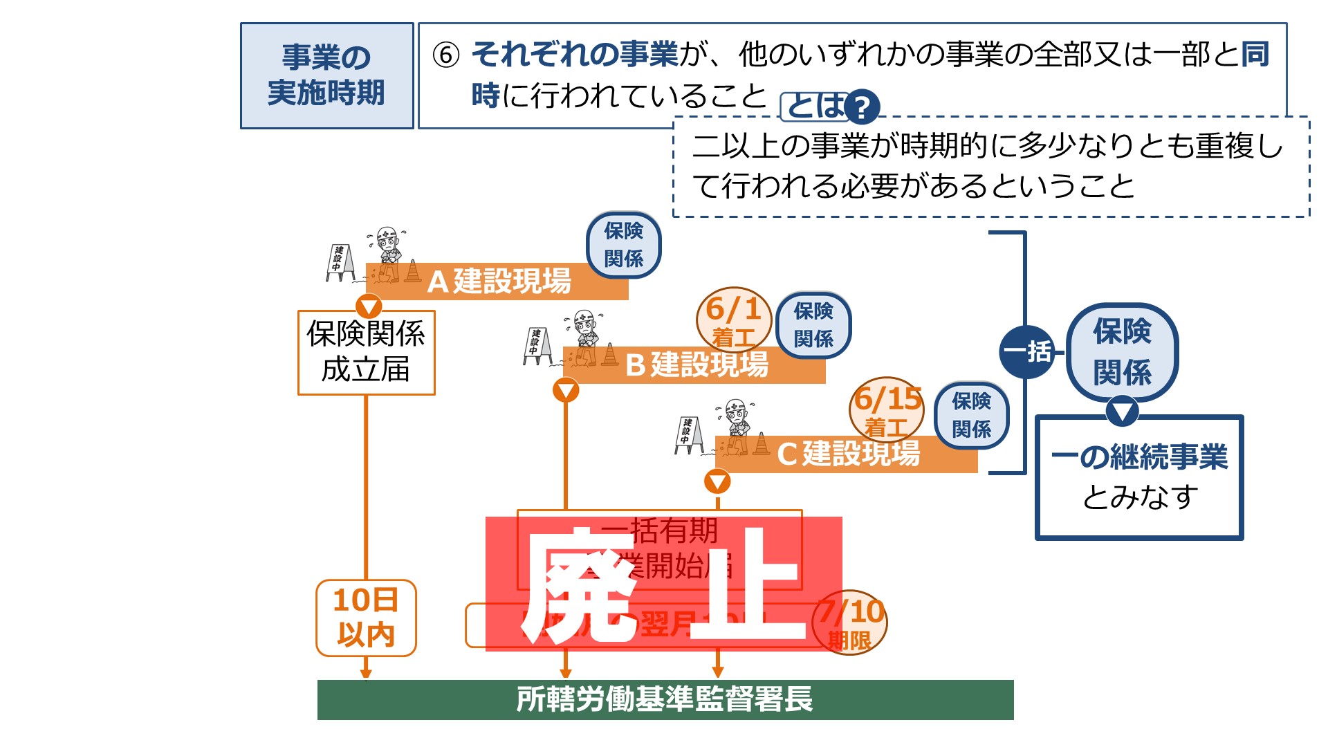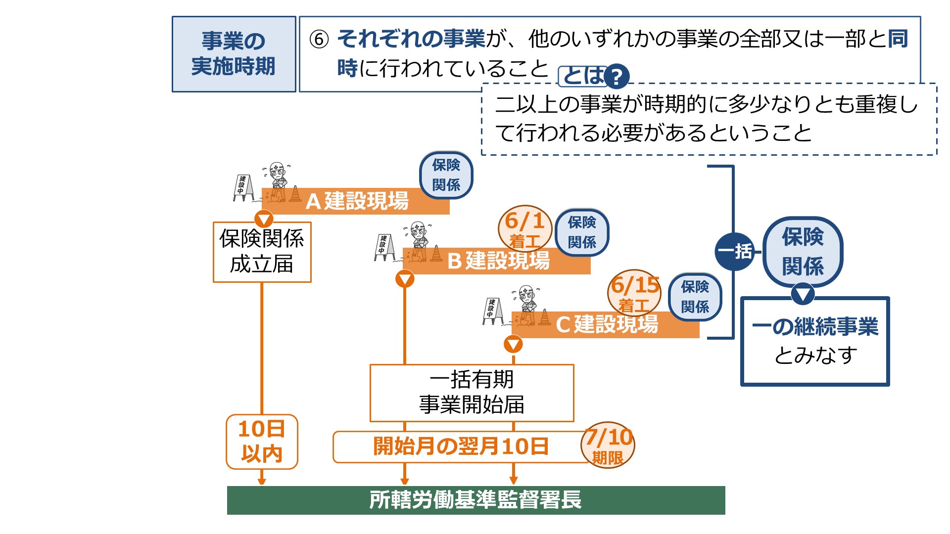 しかし、各事業を開始した翌月10日には、所轄監督署に一括有期事業開始届を提出することになります。