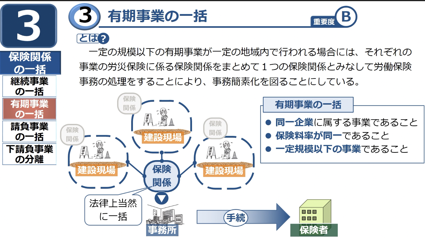 この有期事業の一括制度の対象になった事業は、事業ごとに手続きをとる必要がなくなり、同じ会社が行っている他の事業とまとめて手続きを取ることができます。