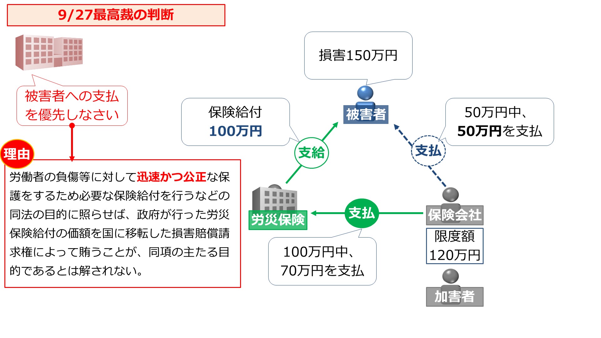 「労災保険法12条の4第1項は、第三者の行為によって生じた事故について労災保険給付が行われた場合には、その給付の価額の限度で、受給権者が第三者に対して有する損害賠償請求権は国に移転するものとしている。(中略)労働者の負傷等に対して【?】な保護をするため必要な保険給付を行うなどの同法の目的に照らせば、政府が行った労災保険給付の価額を国に移転した損害賠償請求権によって賄うことが、同項の主たる目的であるとは解されない。」とするのが最高裁の判断である。