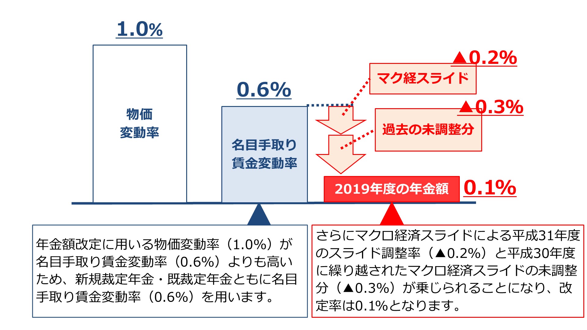 平成31年度の年金額改定では、名目手取り賃金変動率にマクロ経済スライドによる平成31年度のスライド調整率と平成30年度に繰り越されたマクロ経済スライドの未調整分(▲【?】%)が乗じられることになる。
