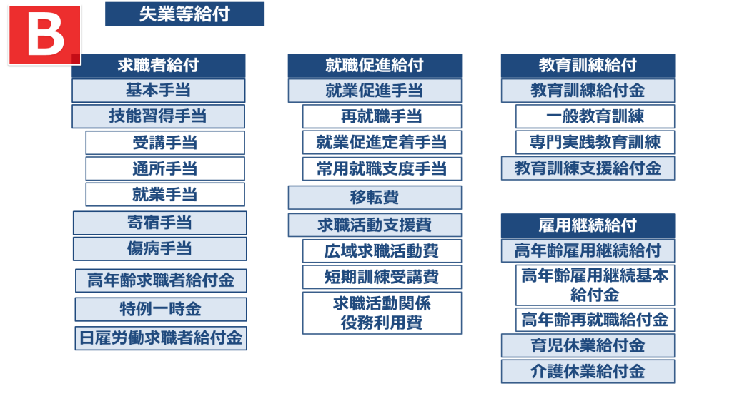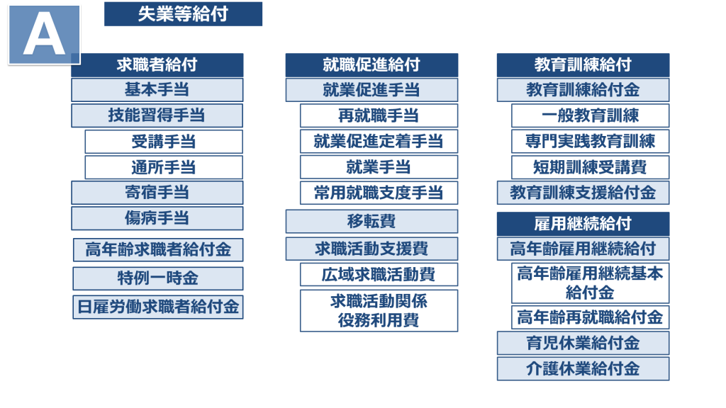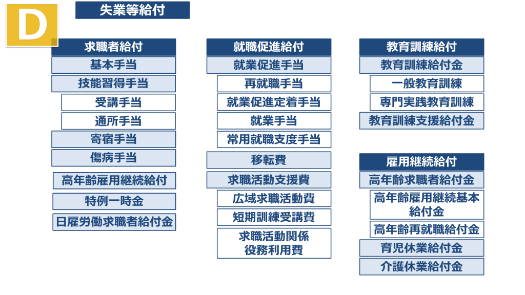 A~Dのうち失業等給付の体系図として最も正しいものは?