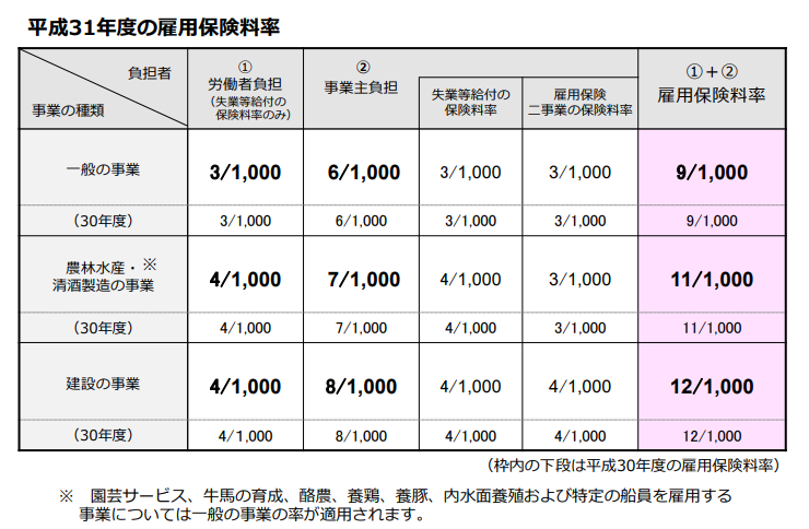 平成31年4月1日から平成32年3月31日までの雇用保険料率は以下の
