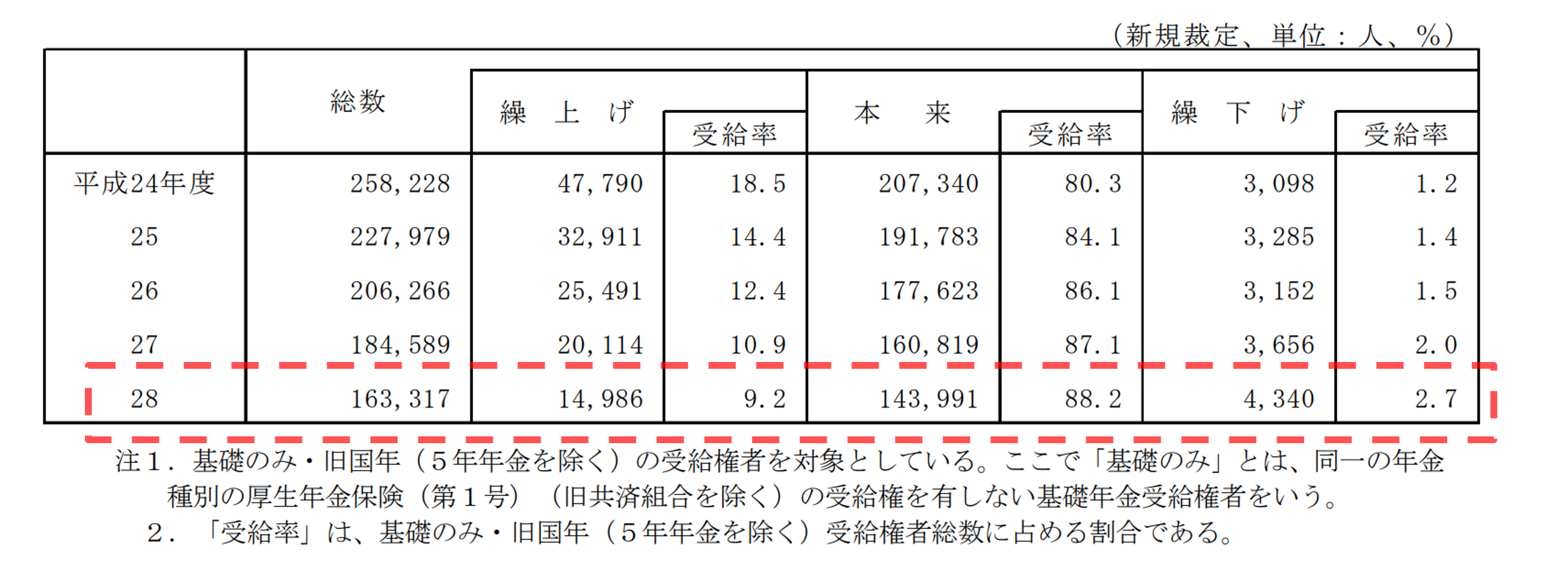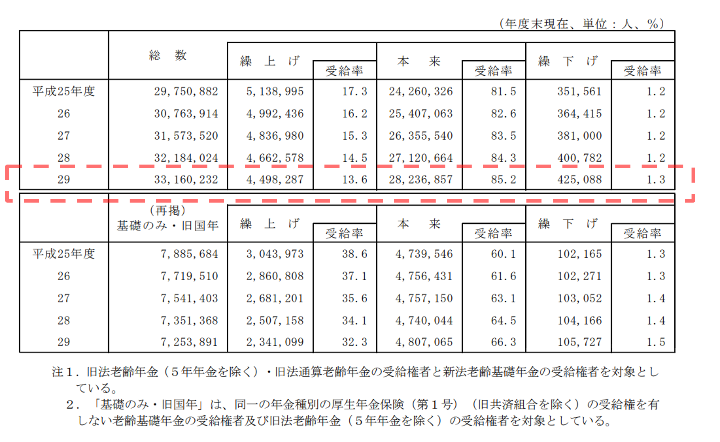 平成29年度厚生年金保険・国民年金事業の概況により、受給権者の繰上げ・繰下げ受給状況の推移をみると、国民年金(5年年金を除く)の受給権者は、繰上げ率が年々低下している。
