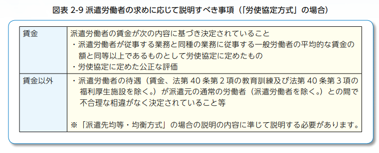 このような状況を踏まえ、「派遣先均等・均衡方式」に加えて、労使の合意によって賃金を決定する「労使協定方式」が設けられました。