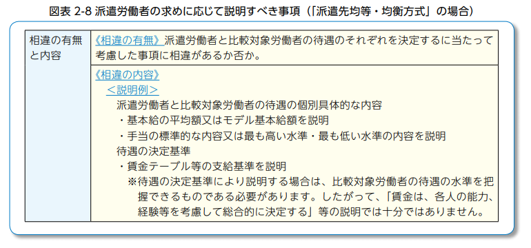 派遣労働者から求めがあった際には、派遣元は選択した待遇決定方式に応じ、以下に示す待遇決定に当たり考慮した事項等を説明する必要があります。また、派遣元は、説明を求めたことを理由に派遣労働者に対して不利益な取扱いをすることを禁止されています。