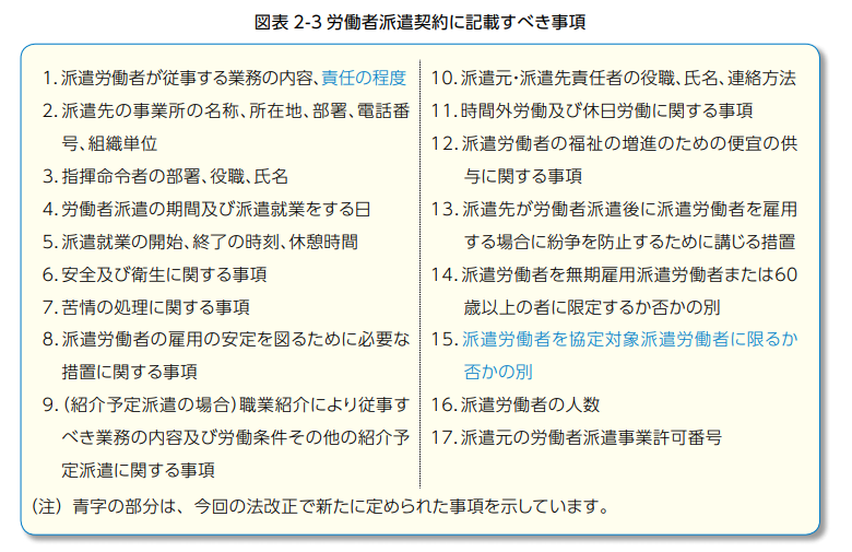 今回の法改正によって、従来から定められている事項に加え、以下の 2 点を労働者派遣契約で定めることが必要になりました。