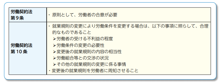この点に関連して、労働契約法では「不利益変更」を行う場合の留意事項を図表 2-10 のように定めています。