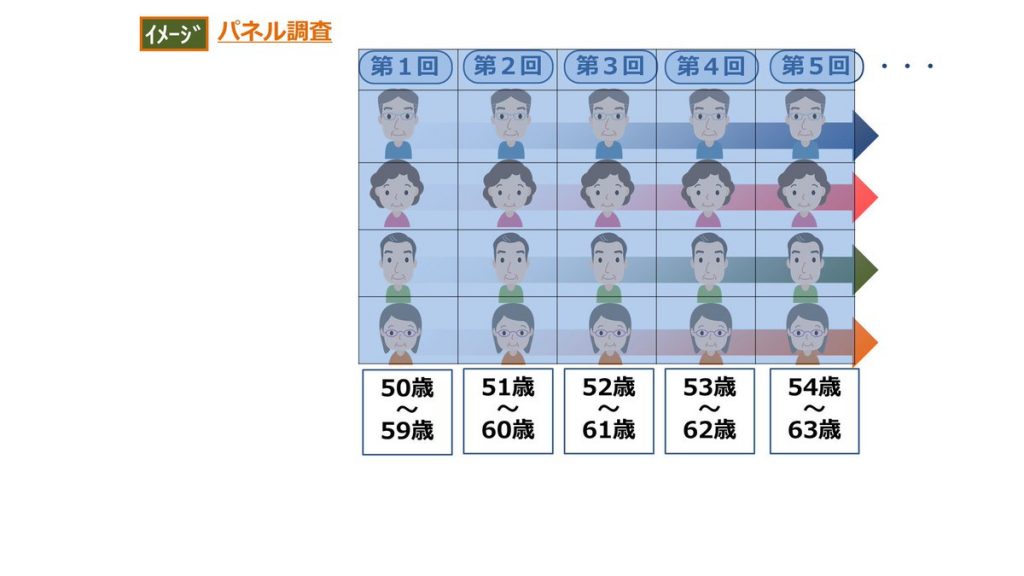 中高年者縦断調査は、団塊の世代を含む全国の中高年者世代の男女を追跡して、その健康・就業・社会活動について、意識面・事実面の変化の過程を継続的に調査するもの。 こういった調査手法をパネル調査といい、過去選択式で出題実績がある。 同じ対象者を、年を重ねるごとに毎年調査をするやり方 その調査結果を表組みにするとアタッ◯25の「パネルっぽく」みえる。 |