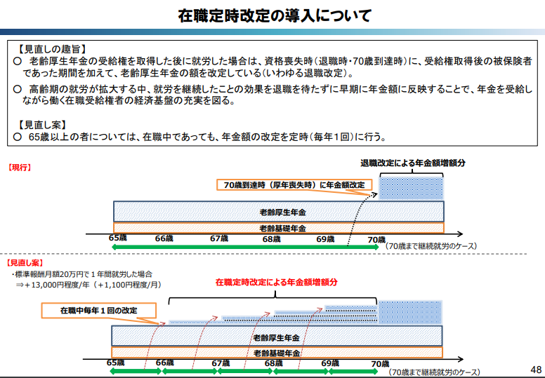 他方で、今般の制度改正においては、65歳以降の老齢厚生年金について在職定時改定の導入を行うこととされた。