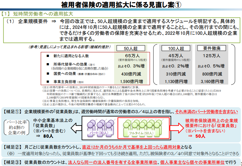 ○今般の改革としては、短時間労働者に対する適用拡大は、中小企業への負担に配慮する観点からまずは50人超の企業までの適用となったが、本来は、企業規模要件を撤廃し、50人以下の企業に対しても、被用者である者には被用者保険を適用すべきである。