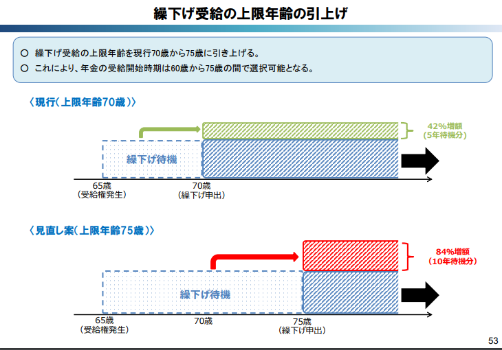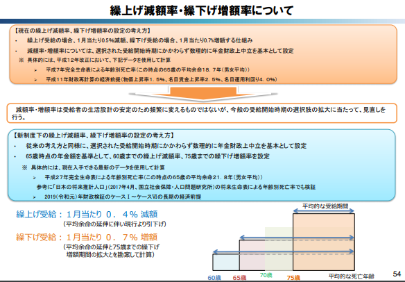 なお、繰上げ・繰下げの増減率は、今般の受給開始時期の選択肢の拡大に当たって見直しを行ったものであるが、年金受給者の生活設計の安定のため、頻繁に変えるべきものではない。