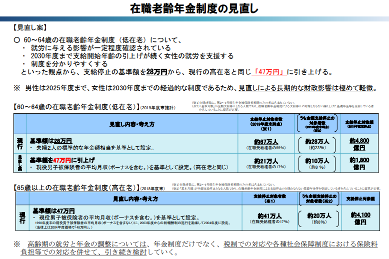 また、現在の高在老の適用基準(47万円)の対象者が、年金と賃金を合計すれば同世代あるいは現役世代と比較しても比較的フロー所得に余裕があることからすると、在職老齢年金制度の単純な見直しは、高所得の高齢者を優遇するものであるとの指摘もある。