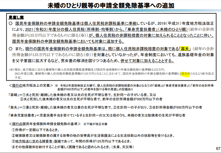 (2)国民年金保険料の申請全額免除基準の対象について、地方税法上の非課税措置の対象に合わせ、未婚のひとり親や寡夫を追加する。